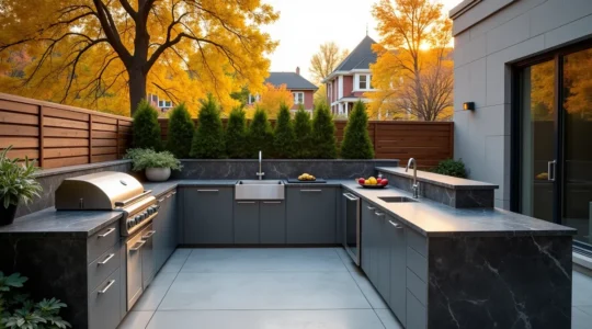 Une cuisine extérieure fonctionnelle respecte les mêmes principes ergonomiques qu’à l’intérieur : le triangle d’activité entre réfrigérateur, zone de préparation et cuisson doit minimiser les déplacements. Mais elle ajoute des contraintes spécifiques : protéger la zone de cuisson des vents dominants (une flamme instable est dangereuse et inefficace), prévoir les raccordements de gaz naturel ou propane avec des conduites conformes au code, et choisir des comptoirs résistants aux cycles gel-dégel comme le granit, le quartz d’extérieur ou le béton scellé.